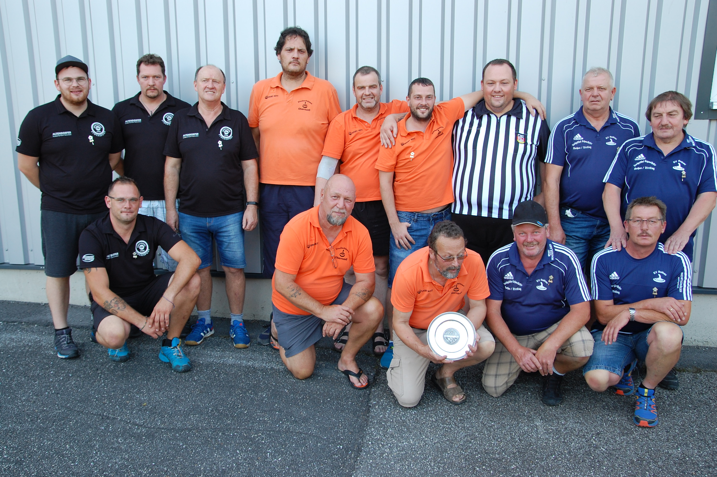 Kreis A-Klasse am 23.07.2017 in Hauzenberg: von links SR Hermann Schäffner (EC Hauzenberg), Bogner Tobias, Reschauer Maximilian, Bogner Alois und Hannes Fürlinger vom EC Saßbach; Datzmann Josef, Gottinger Leonhard, Schinkinger Rudolf und Klinger Erwin sowie Kurz Johann, Fritz Hoffmann, Josef Gadringer und Josef Strahberger vom EC Dreisessel Altreichenau